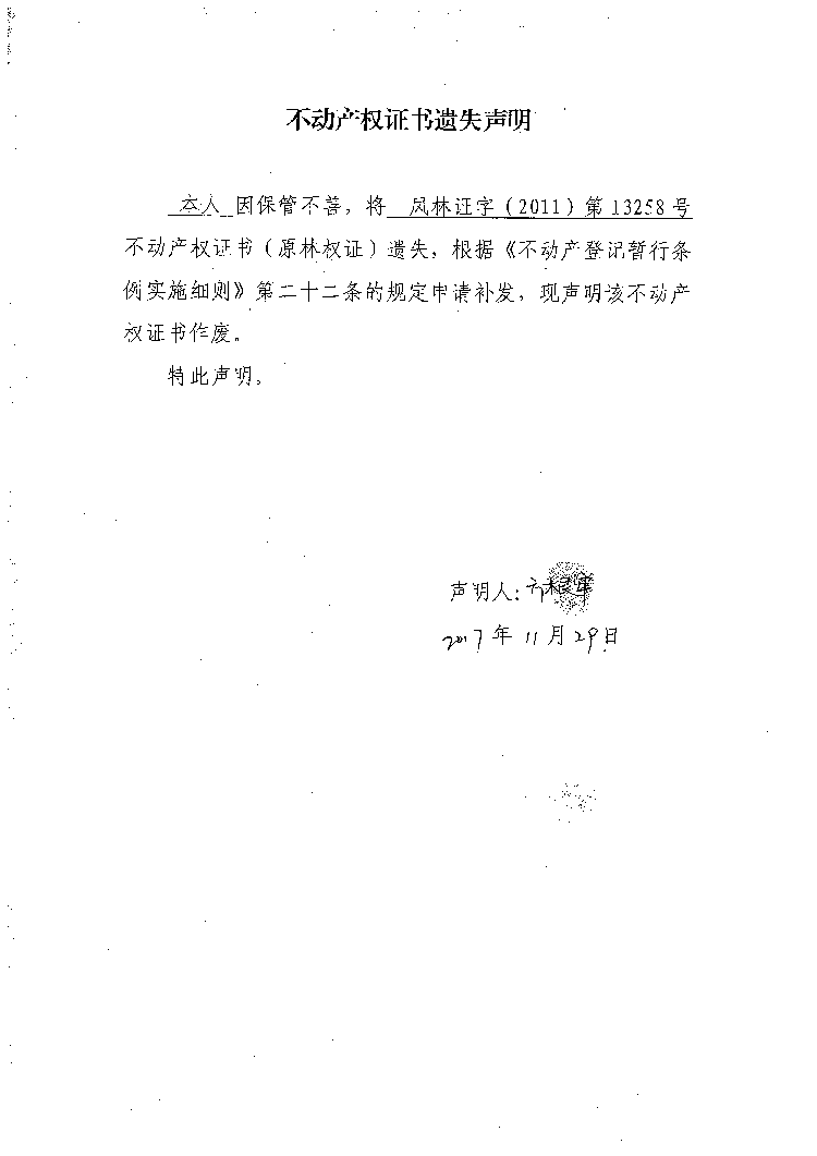 根据《不动产登记暂行条例》等相关规定,现将方根牢不动产权证书(原林权证)遗失声明予以公告,若对公告的不动产权有异议者,请于公告之日起15个工作日内向凤县不动产登记局书面提出申请复查。逾期没有提出异议的,即认为上述公告有效,并按规定予以补证,原不动产权证书作废。