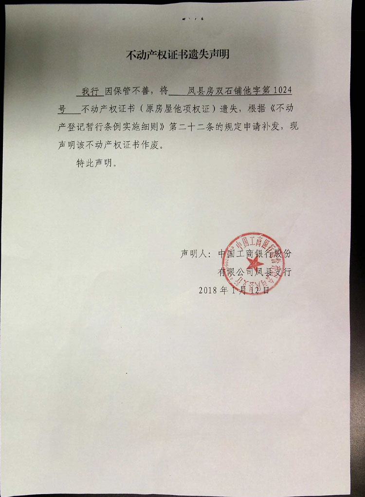 根据《不动产登记暂行条例》等相关规定,现将中国工商银行股份有限公司凤县支行房屋他项权证遗失声明予以公告,若对公告的不动产权有异议者,请于公告之日起15个工作日内向凤县不动产登记局书面提出申请复查。逾期没有提出异议的,即认为上述公告有效,并按规定予以补发,原房屋他项权证作废。