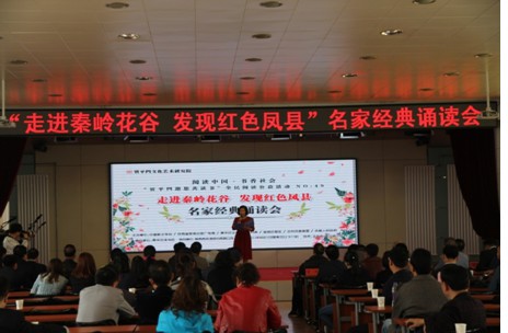 名家经典诵读会现场,中省文化学者、作家、文艺工作者及陕甘川宁十六市媒体人汇聚一堂,以“贾平凹邀您共读书”为主题,开展了经典诵读、诗歌朗诵、图书捐赠、文艺表演等活动,贾平凹文化艺术研究院“读书大使”海茵、陈爱美以及“读书使者”麻天阔、晓河、杨枫、李翔、郑凯、王红梅等文化艺术界,朗诵了贾平凹、陈忠实、周明、杜鹏程、王宗仁、吴克敬、红孩、耿翔、吕向阳等名家经典作品,用声音传递真情,用诵读温暖人生,激发全民读书的热情,促进了凤县学习型社会、学习型组织、学习型家庭的建设。
